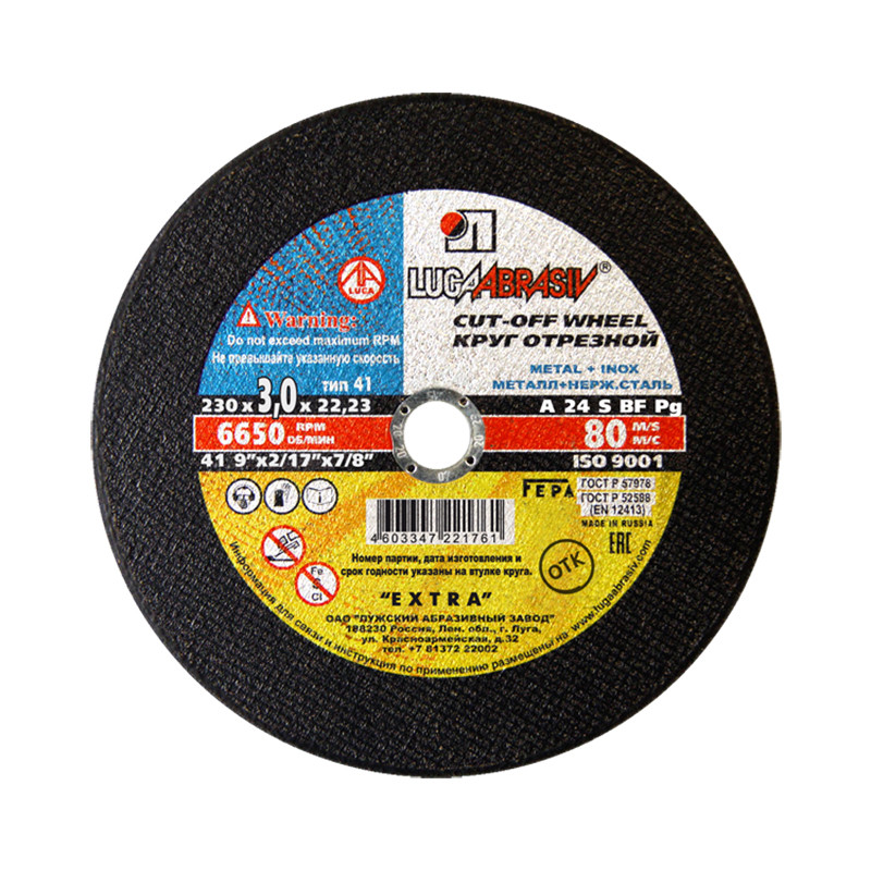 Круг отрезной 230х3х22 (бакелитовый) армированный по металлу предназначен для отрезки стальных прутков, профилей и т.д. с помощью "болгарок" и отрезных станков.