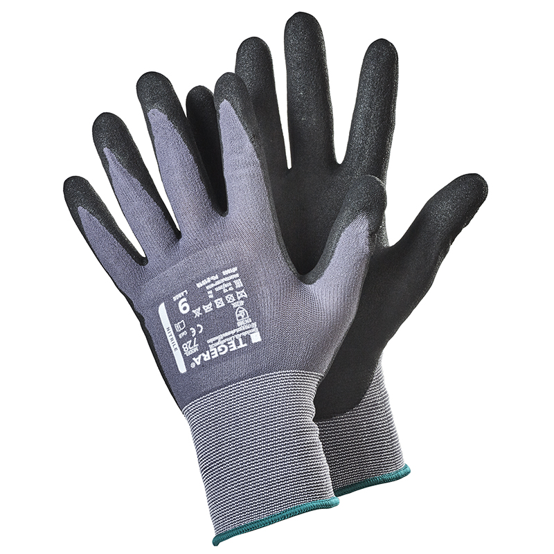 Перчатки из синтетического материала, Нитрил, Обливка области ладони, Lycra®, Нейлон, Плотность вязки 15 gg, Текстура типа "песок", Cat. II, Цвет черный/серый, Маслобензостойкие в области ладони, для сборочных работ.