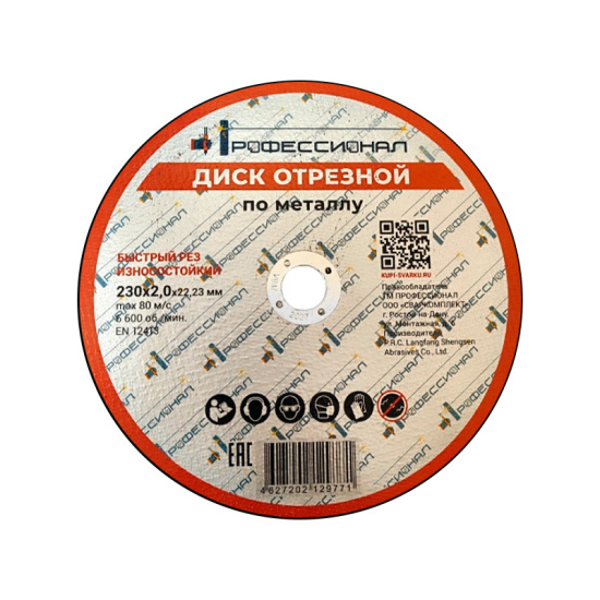 Круг отрезной по металлу ПРОФЕССИОНАЛ 230 2,0 представляет собой инструмент для отрезки металлических изделий и заготовок. Он имеет диаметр 230 мм и толщину отрезного диска 2,0 мм.
