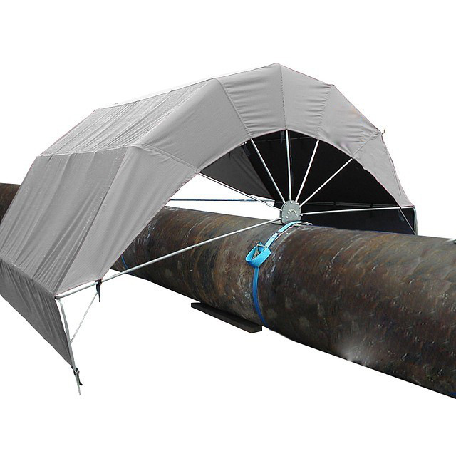 Укрытие состоит из сборно-разборного каркаса, выполненного из нержавеющей, окрашенной конструкционной стали и тента из масло, -водоотталкивающей тентовой ткани с огнеупорной пропиткой «PROBAN». Верхний свод тента выполнен из огнеупорной, морозостойкой, светопропускающей тентовой ткани. Для регулировки высоты укрытий в зависимости от рельефа местности, опоры каркаса выполнены регулируемыми по высоте, имеется регулируемый рукав для герметизации укрытия на трубе, предусмотрен вход для рабочих. Для удаления сварочных газов с торцев палатки предусмотрены вентиляционные отверстия, по желанию заказчика устанавливаются высокопроизводительные вытяжные вентиляторы с диапазоном температур: -45ºС/+50ºС.