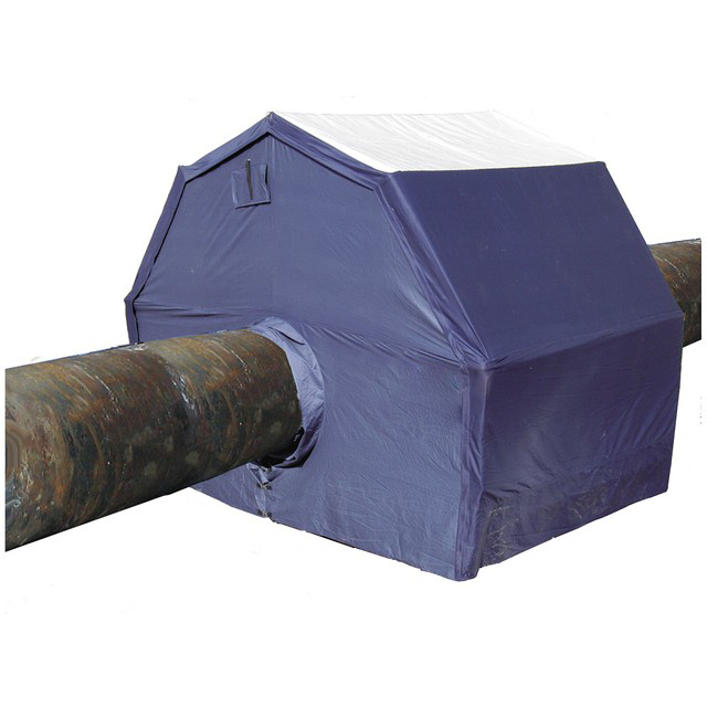 Укрытие состоит из сборно-разборного каркаса, выполненного из нержавеющей, окрашенной конструкционной стали и тента из масло, водоотталкивающей тентовой ткани с огнеупорной пропиткой «PROBAN». Верхний свод тента выполнен из огнеупорной, морозостойкой, светопропускающей тентовой ткани. Для регулировки высоты укрытий в зависимости от рельефа местности, опоры каркаса выполнены регулируемыми по высоте, имеется регулируемый рукав для герметизации укрытия на трубе, предусмотрен вход для рабочих. Для удаления сварочных газов с торцев палатки предусмотрены вентиляционные отверстия, по желанию заказчика устанавливаются высокопроизводительные вытяжные вентиляторы с диапазоном температур: -45ºС/+50ºС.