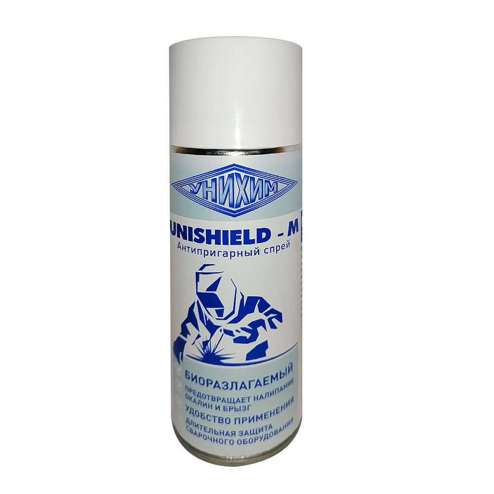 UNISHIELD-M – аэрозоль на основе специально подобранной смеси биоразлагаемых природных триглицеридов, предотвращающий налипание окалины на сварочном оборудовании (лазерная и плазменная резка, MIG/MAG сварка) и свариваемых изделиях. Аэрозоль формирует на поверхности антипригарную пленку, отталкивающую брызги металла, обеспечивая непрерывность сварочного процесса и защиту оборудования (наконечники и сварочные сопла).