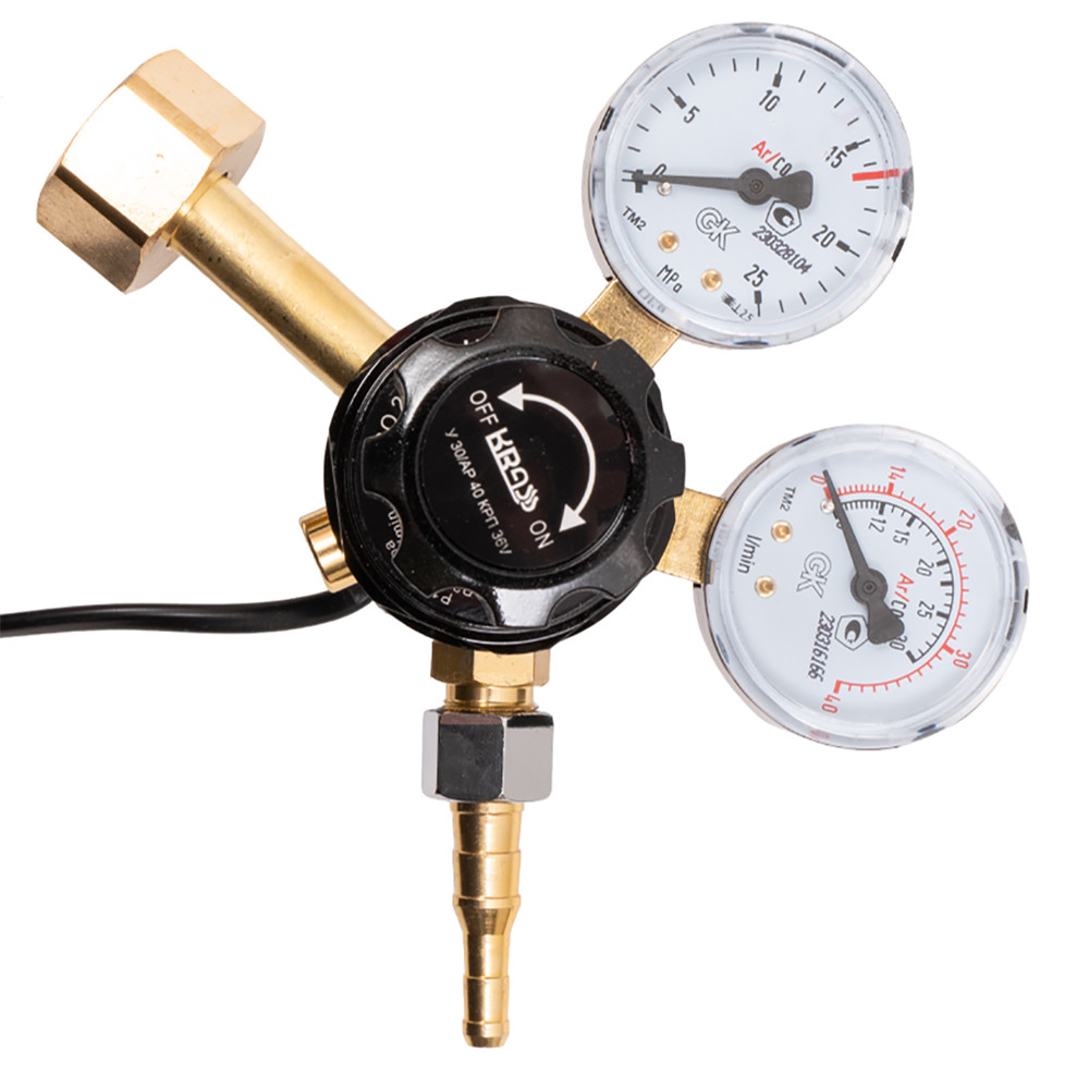 Регулятор универсальный для углекислого газа и аргона У-30/АР-40-КРП 36V с встроенным подогревателем 36V, KRASS - регулятор расхода газа предназначен для понижения и регулирования давления газа, поступающего в регулятор из баллона, и автоматического поддержания постоянным заданного расхода.
