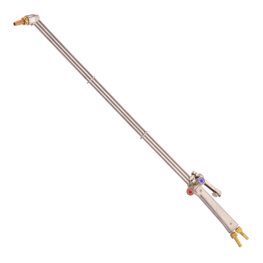 Резак рычажный пропановый длинный КОРД Р-04П-L1000 (90 гр., 110 гр.) - это резак универсальный повышенной надежности (с рычажным включением режущего кислорода), предназначенный для ручной разделительной резки малоуглеродистых и низколегированных сталей толщиной до 300 мм (по спец.заказу до 500 мм) с использованием пламени, образуемого сжиганием горючего газа с кислородом.