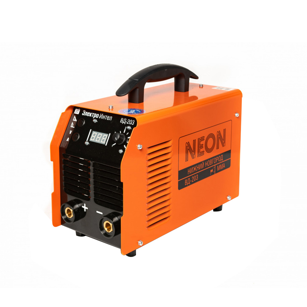 Инвертор сварочный NEON ВД-203- инверторный сварочный аппарат для ручной дуговой сварки штучными электродами ММА на постоянном токе. Рабочий температурный диапазон от -45 до +40 градусов позволяет проводить сварочные работы этим аппаратом вне помещения в самых разных климатических условиях, в независимости от поры года. Высокий КПД в 90% позволяет эффективней использовать технический ресурс и уменьшить количество затрачиваемой электроэнергии. Коэффициент нагруженности инвертора при максимальном сварочном токе превышает 60%, что уменьшает время простоя и приближает аппарат к профессиональным устройствам.. Сварка производится электродами любых типов - сварочными электродами постоянного тока и специальными электродами.