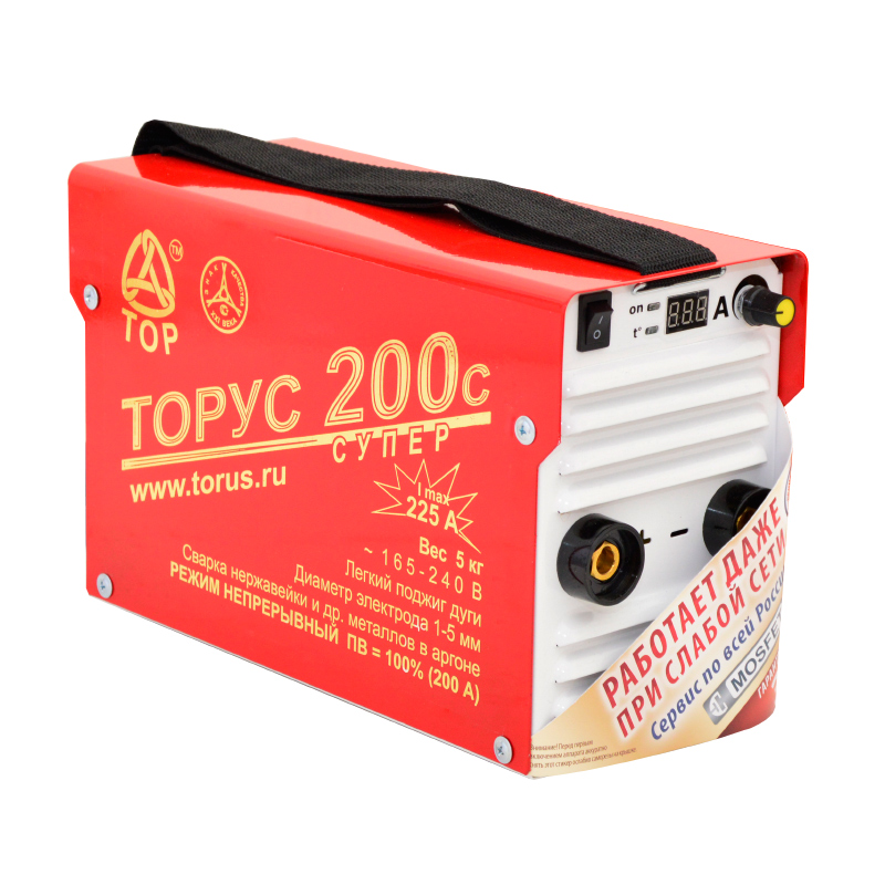 Аппарат "Торус-200с" - исполнение "Супер", имеет ПВ=100% на максимальном токе в 220 Ампер, обладая всеми возможностями и достоинствами аппарата "Торус-200". Таким образом, можно с уверенностью сказать, что со сварочным аппаратом "Торус-200с" сварщик может работать полную рабочую смену без перегрева аппарата. Данная модель может быть рекомендованна для сварочных работ на промышленных и строительных объектах. Этот аппарат также может быть использован и в быту: будь то дачный участок, гараж или небольшая мастерская.