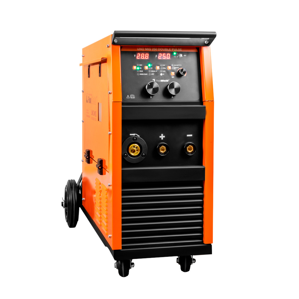 Сварочный полуавтомат UNO MIG 250 DOUBLE PULSE с синергетическим управлением позволяет сваривать изделия из углеродистой и нержавеющей стали, а также алюминия и его сплавов. Данная установка имеет следующие виды сварочного процесса: полуавтоматическая сварка (MIG/МAG), полуавтоматическая сварка в импульсном режиме (PULSE), полуавтоматическая сварка в режиме двойного импульса (DOUBLE PULSE), ручная дуговая сварка штучным электродом с покрытием (ММА). Синергетическая система управления существенно облегчает настройки сварочных параметров. Импульсный режим сварки PULSE представляет из себя управляемый перенос металла без разбрызгивания с высокой концентрацией сварочной дуги и хорошими металлургическими свойствами получаемого соединения. Режим DOUBLE PULSE необходим, чтобы создать достаточный провар и хороший внешний вид сварного шва. Полуавтомат собран на тележке, имеющей площадку для размещения газового баллона. UNO MIG 250 DOUBLE PULSE предназначен для широкого использования в промышленности и в отраслях по производству различных металлоконструкций.