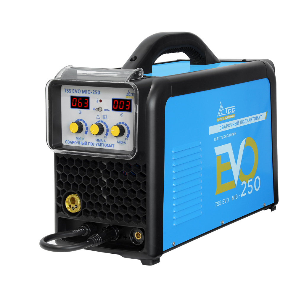 TSS EVO MIG-250 - сварочный полуавтомат инверторный. Компактный, легкий, удобный для переноски, а также при транспортировке, хранении. Корпус из листовой стали, надежно защищает внутренние элементы от повреждения. Предназначен для полуавтоматической сварки в среде защитных газов (MIG/MAG), а также ручной дуговой сварки покрытым электродом (ММА). Аппарат имеет защиту от перегрузки, индикатор перегрева и неисправности, обеспечивая высокий уровень безопасности и надежность устройства. Так же данный аппарат имеет защиту от скачков напряжения. Высокое напряжение холостого хода обеспечивает легкость поджига сварочной дуги. Высокая стабильность сварки в реальном времени, простое интуитивно понятное управление сварочными параметрами.