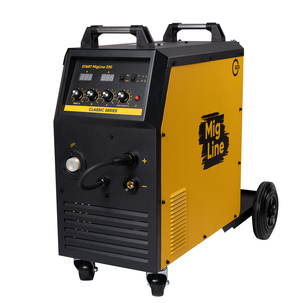 Сварочный полуавтомат инверторного типа START MigLine 330 - мощный и надежный, выполнен в специальном корпусе на передвижной тележке с возможностью легкой транспортировки данного аппарата, предназначенный для полуавтоматической сварки в среде защитных газов (MIG/MAG) и ручной дуговой сварки MMA.