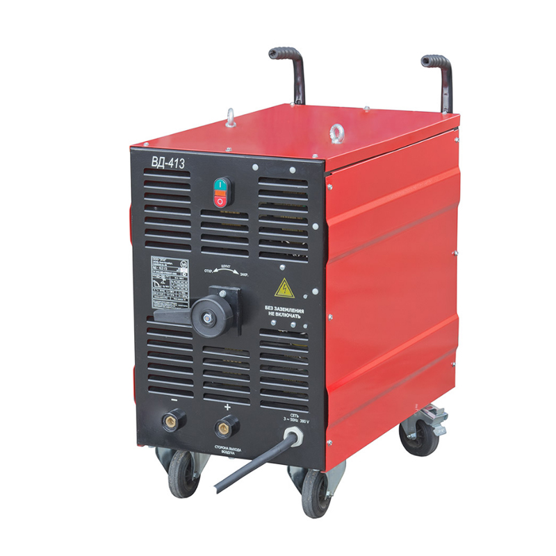 Сварочный выпрямитель типа ВД-413 предназначен для ручной дуговой сварки покрытыми электродами изделий из стали на постоянном токе. Сварочный ток плавно регулируется с помощью механического перемещения магнитного шунта горизонтального исполнения. Градуировка тока дуги выполнена на внешней поверхности шунта. Оригинальный механизм шунтового регулирования резко уменьшает время, необходимое на смену режима сварки. Выпрямитель отличается простотой, надежностью конструкции, низким весом, мобильностью и по сварочным свойствам не уступает известному выпрямителю ВД-306. Выпускается в использовании с приборами и без них.