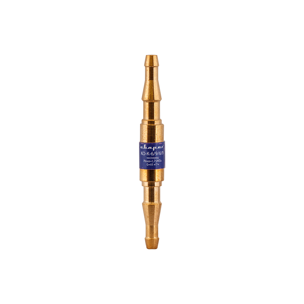 Клапан обратный КО-К-6/9/6/9 (кислород, в разрыв рукава) - служит для защиты от попадания кислорода в рукав, тем самым защищая от случайной детонации внутри рукава.