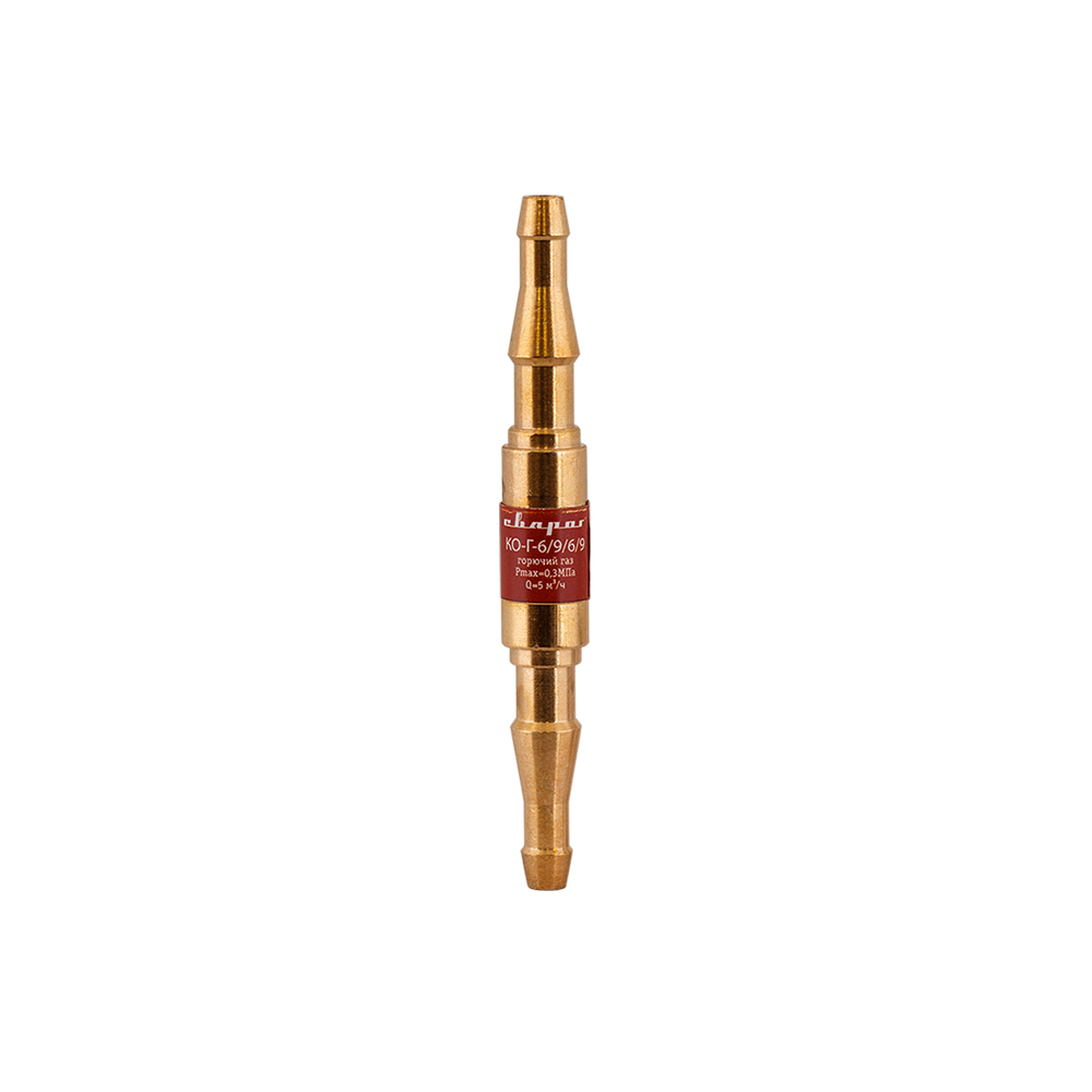 Клапан обратный КО-Г-6/9/6/9 (пропан, ацетилен, в разрыв рукава) - служит для защиты от попадания горючего газа в рукав с кислородом, тем самым защищая от случайной детонации внутри рукава.
